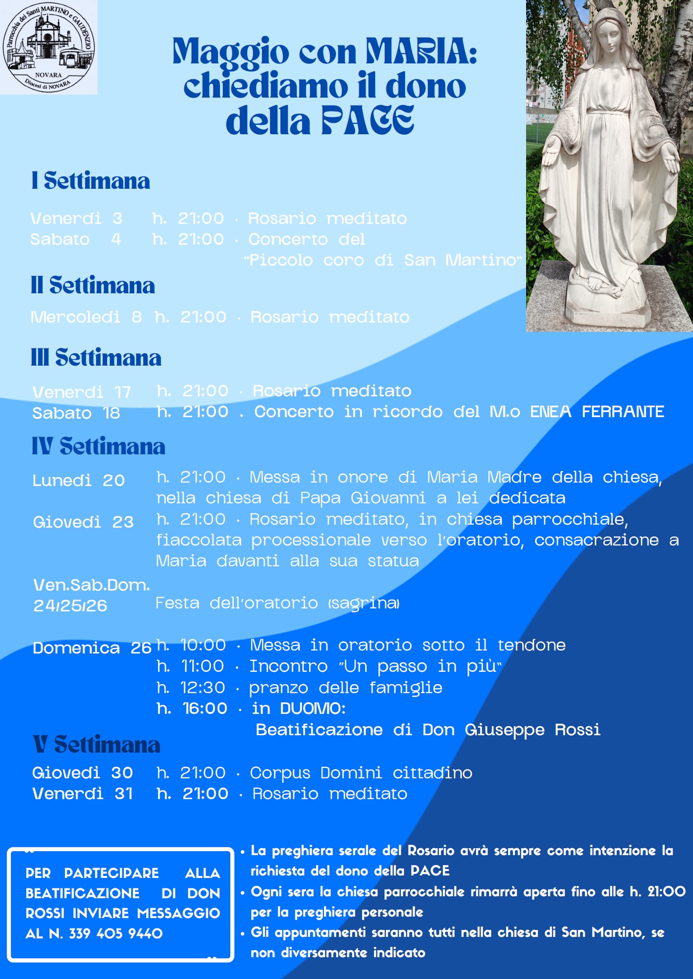 Nelle locandine l’intenso programma del mese di maggio: il programma del mese mariano, il concerto in onore del Maestro Ferrante, la Sagrina.