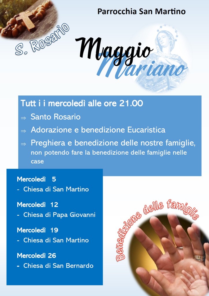 La difficile situazione ci impedisce da due anni di fare la consueta visita casa per casa per la benedizione delle famiglie. Maggio Mariano è la proposta per penetrare nel Mistero di Cristo e con la preghiera di Mons. Bello, affidare a Maria ciascuno e tutti: ognuno di noi, le nostre famiglie, la nostra comunità.